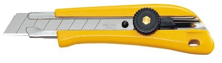 Řezač s tvarovanou rukojetí, kulatá pojistka k posunu čepele.