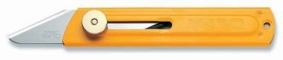 Malý celokovový nůž, kulatá pojistka k posunu čepele. Náhradní břit je oboustranný