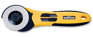 Velký kruhový otočný řezač s dělenou krytkou čepele, průměr 60 mm, na tvarované rukojeti je protiskluzová guma, pro pravou a levou ruku.