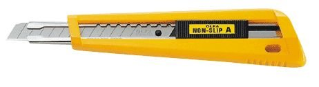 Řezač s rukojetí z protiskluzového materiálu, plochá pojistka k posunu čepele, automaticky blokovaná čepel.