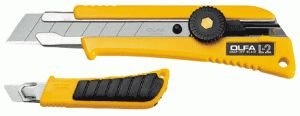 Řezač s protiskluzovou gumou na rukojeti, kulatá pojistka k posunu čepele.