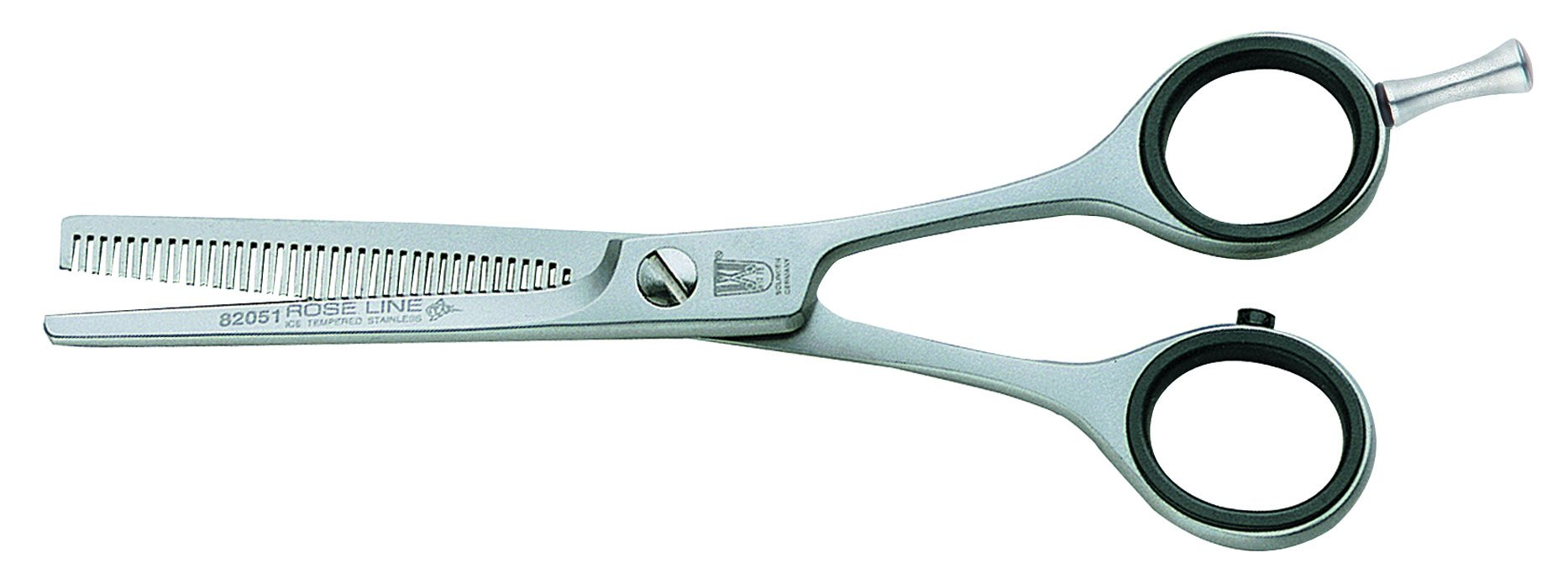 jsou vyrobeny ze šlechtěné podmražované oceli se saténovou úpravou rukojetí. Obě ramínka nůžek jsou spojena zapuštěným stavitelným šroubem. Afilační nůžky Rose Line 39 zubů a délku 5,25".
