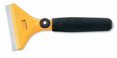 Celokovová škrabka s gumovou rukojetí na odstraňování polepů, délka rukojeti 20 cm, vyměnitelná čepel